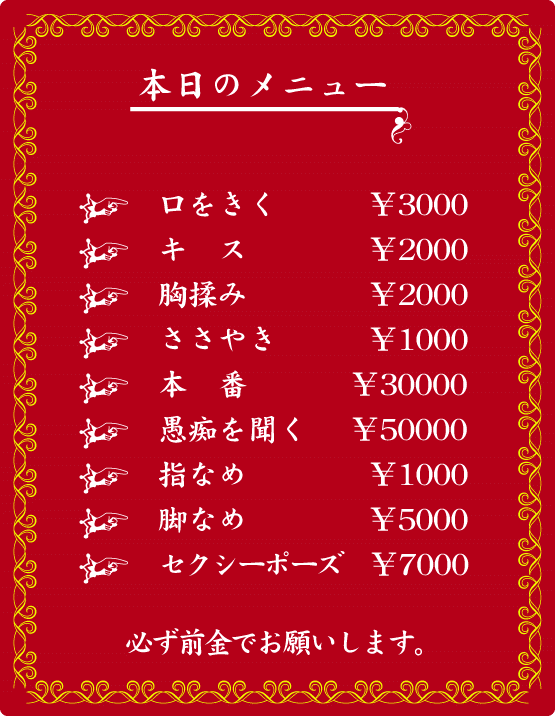 口をきく\3000/キス¥2000/胸揉み¥2000/ささやき¥1000/本番¥30000/愚痴を聞く¥50000/指なめ¥1000/足なめ¥5000/セクシーポーズ¥7000 必ず前金でお願いします