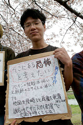 ■2003年4月27日(日) ■出町柳三角州ふきんにて ■ちょっとしたお願い:35cm×35cmくらい(レコードジャケット)の大きさのボードを各自で作って、それにあなたの思いを書いて、家を出たときから人に見えるように持って、会場まで来てください。あっでも、私は無理という人はいいです。強制はしませんので。 |