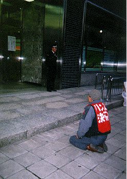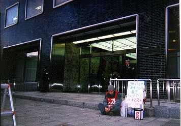 午後0時からハンスト開始。午後3時45分、北電本社前に到着。午後4時に北電本社に入ろうとするも警備員に制止される。警備員のほか玄関には社員が十余名待機し、全く予期せぬ異常な警戎ぶりだった。宮沢氏は、玄関前で、「先にお送りしたお願いの手紙のお返事を社長にお伺いしたい」と丁寧に話をするが、北電側は全く無視。宮沢氏は地にひざまづき、「どうか、道民の十分な議論なし環境アセスメントに着手するの止めてください。お願いします」と土下座した。その時彼は涙を流していた。あまり芝居のできるような人ではないので、おそらく本心から泣いていたのだろう。彼とはいろいろ意見の合わないところもあるが、彼の一途な気持ちには心を打たれた。新聞記者が北電に入り何か話しをしたのか、後になって広報担当者が出てきて一応形式的な対応を行ったが、それほ誠実なものではなかった。その後中央署の刑事らしき4名が来てクレームをつける。「警察の腕章を付けてらっしやいますが、警察の方ですか?警察の方なら名前を教えて下さい」と宮沢氏ほ言うが無視して立ち去る。彼等はその後しばらく近くの陰で何やら相談。その後2名の制服警官が支援の会のメンバーの車にやってきて「通報があったので移動させてもらえますか」と免許証の提示を求める。誰の通報なのか考えるのも野暮だが、他にも多くの車がいつも駐車しているのに、なんとも、わかりやすいいやがらせだ。この日の街頭カンパ 12,817円