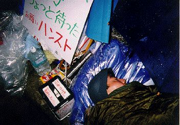 毎日3回(朝の開店時、昼休み、夕方閉店前に土下座してお願いを続る。天候が不安定、断続的に雨がふる。ひさしもなく、テントも張れないので、雨カッパを着、地面から熟を奪われないように、二条市場から発泡スチロールの箱の蓋を4枚もらってくる。寝袋を3枚用意したが雨のため使えず、それらを透明のごみ袋にいれクッションがわりに使う。ビニールシートを掛けているが、それでも雨に濡れる。かなり消耗しているはずだ。熱いポットに入った沖縄茶のさし入れ。本当にあったかい。夜になっても雨は降り続く。
