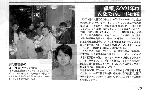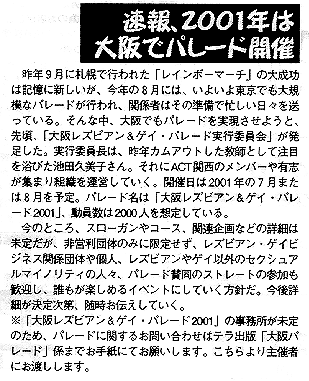 私は、ともにゲイ・フロント関西を支える仲間であるはずの打越さんに対してこの様な批判を直接伝え、誤ったやり方をとらないように強く要請しました。その結果かどうかは正式には分かりませんが、4月1日に予定されていた池田久美子実行委員長の名義の「大阪レズビアン&ゲイ・パレード2001」の呼びかけは行われず、その変わりに5月20日の話し合いが呼びかけられています。