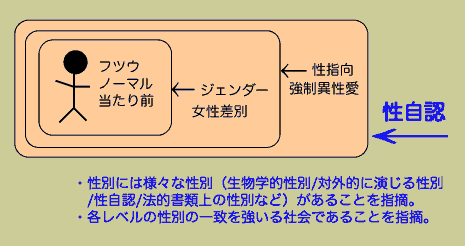 更にすすんで、「ジェンダーの強制がある」、さらに「強制異性愛/異性愛中心主義」というものがあるというのに対して、実はこのワールドというのは、たとえば「性別違和のない人のワールド」である、性別違和がないことを「当たり前のこと」としていた、各種レベルの性別の一致を強いていた、ということを明らかにしたのが性自認、という言葉。