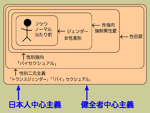 ところが、この枠組み、つまり、ノーマルな世界に対しての「ジェンダー/性別は社会的なものなのだ」という問題提起。ノーマルな世界が実は「女性差別の社会である」ということ。このことは明らかになったんだけど、でもこれだけではやっぱり不十分で。実はこのワールド自体が強制異性愛/異性愛中心のワールドだったと、次に明らかにしたのが「性指向」の概念だと思います。