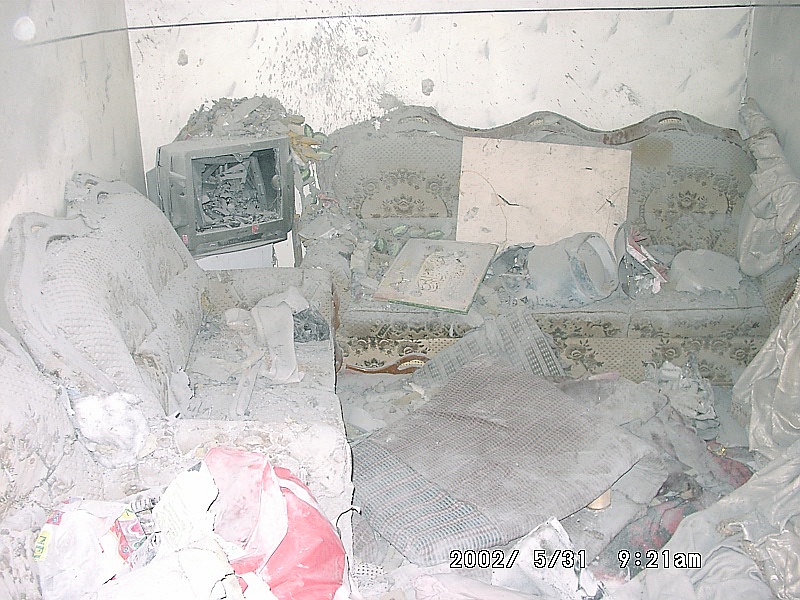 (写真)難民キャンプの中は、こういうふうに荒らされてるわけですよ。これはどうかんがえたって弁解は出来ないんで。だけど、パレスチナ人だけがいたらこんなことが出来ちゃう。テレビが壊されていますね。どうして壊されているんだとイスラエル兵に聞くと、「あれは私がやったんではない。一部のイスラエル兵に悪い事をする人がいるかもしれないが私はしない」そう言いますよね。第三者の見てる人がいると悪さしにくい。